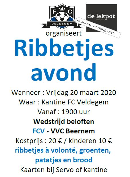 Vrijdag 20 maart: Ribbetjes à volonté [AFGELAST] Delen: Delen op X (Opent in een nieuw venster) X Share op Facebook (Opent in een nieuw venster) Facebook Vind-ik-leuk Aan het laden...