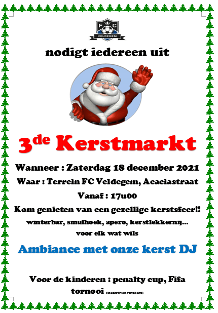 Ho ho ho ! Op zaterdag 18 december organiseren we opnieuw onze wereldberoemde kerstmarkt op ons voetbalterrein ! Kom genieten van een gezellige kerstsfeer met winterbar, smulhoek, apero, kerstlekkernij…