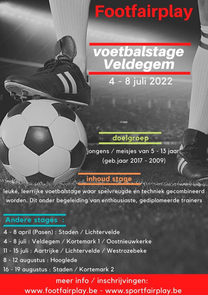 Wegens succes verlengd: in de zomervakantie is er opnieuw een jeugdvoetbalkamp op de terreinen van FC Veldegem. Ons zomervoetbalkamp i.s.m. Footfairplay gaat volgend jaar door van maandag 4 juli t.e.m. vrijdag 8 juli 2021.