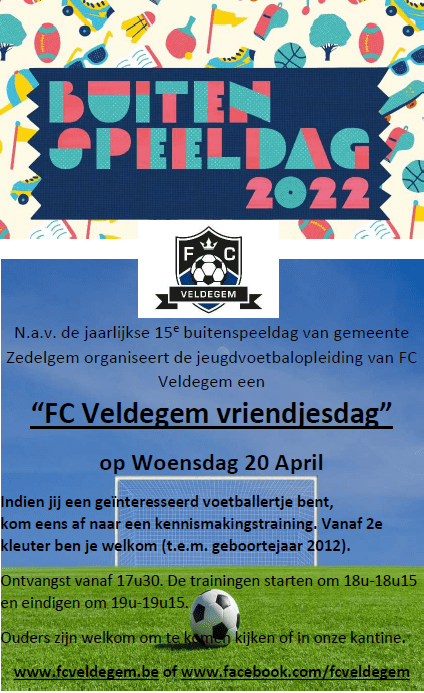 Buitenspeeldag 2022: vriendjesdag op woe 20 April De jeugdvoetbalopleiding van FC Veldegem organiseert een “FC Veldegem vriendjesdag” op Woensdag 20 April: Delen: Delen op X (Opent in een nieuw venster) X Share op Facebook (Opent in een nieuw venster) Facebook Vind-ik-leuk Aan het laden...