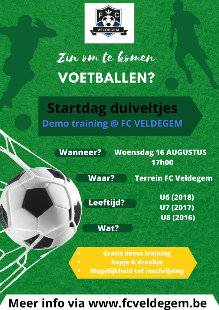 Nieuwe spelertjes welkom op startdag 16 Aug Heb je zin om te komen voetballen? Kom eens vrijblijvend testen op onze startdag ! Delen: Delen op X (Opent in een nieuw venster) X Share op Facebook (Opent in een nieuw venster) Facebook Vind-ik-leuk Aan het laden...